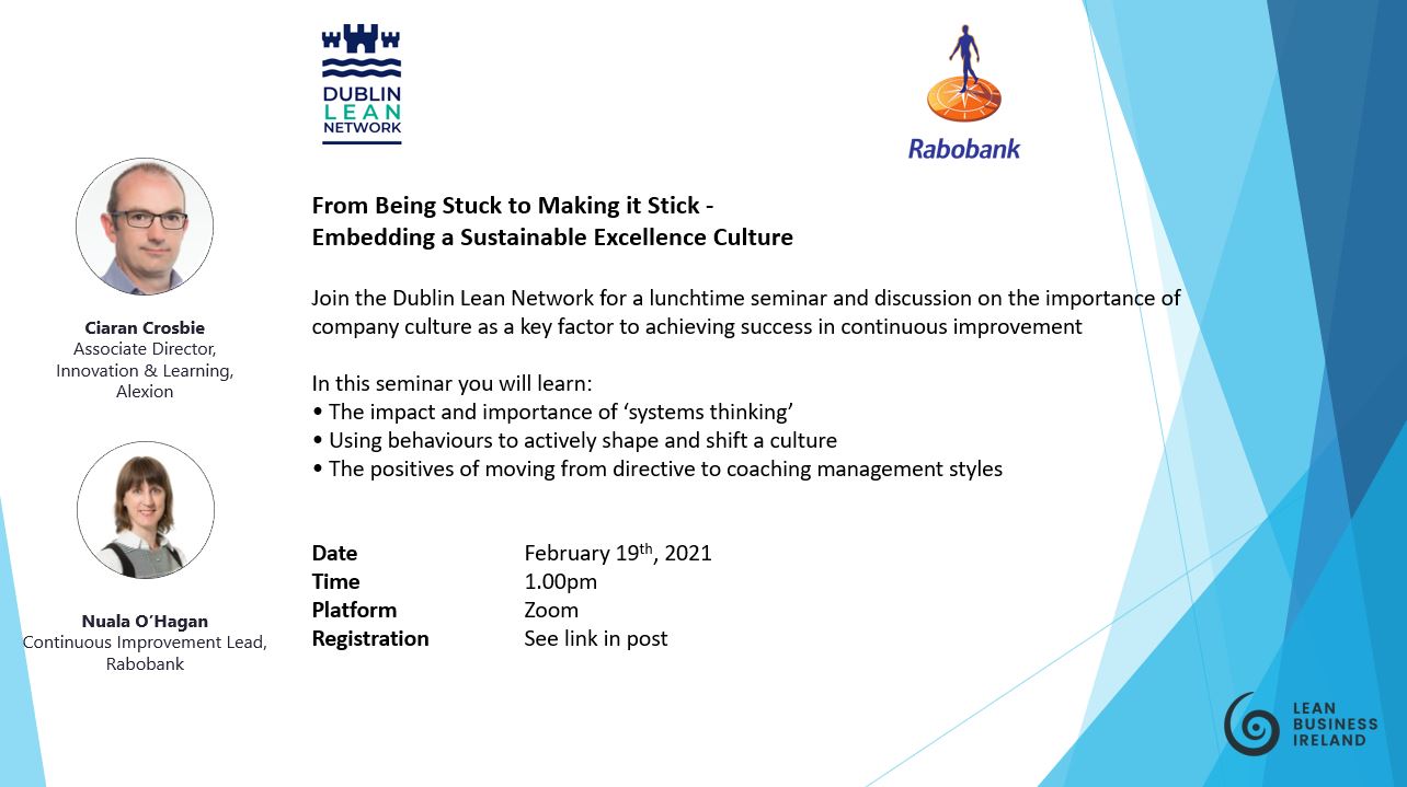 Join Ciaran Crosbie of the Dublin Lean Network for a discussion with Nuala O’Hagan of Rabobank as they explore the best methods to embed a culture of excellence.